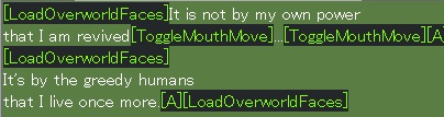 As you can see, there's quite a few [LoadOverworldFaces] here. You might have seen it around in the World Map segments, or you may not exactly know what it does, like I did. While the name seems suited for the mugs appearing on the WM, this is actually just a command that lets you continue an event parallel to the dialogue that's happening. You'll see what I mean in just a second.
