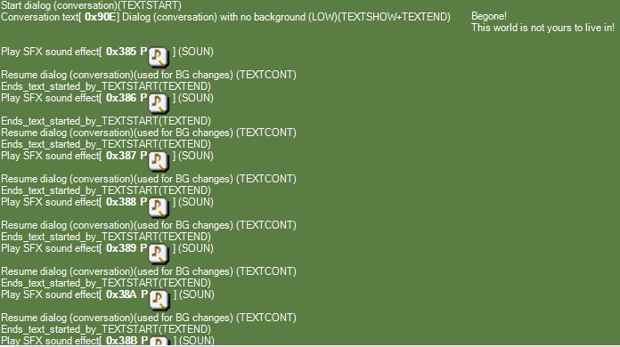 So to understand the relationship between LOF and this repeating pattern, look back to the dialogue. Before the text begins, we put in LOF, and what that does is continue the event. And what is (usually) following suit? Playing a SFX. So what we are doing is playing the associated voice line at that time as the text is playing to make it seem like proper voice acting. What TEXTCONT and TEXTEND's job is to **halt the event from proceeding any further** past what is intended to be played. That is why we always put LOF right after the [A] press so that the SFX/voice plays only that line of text and doesn't accidentally skip to the bottom of the events. It's a long repeat of SFX>CONT>END, but it works. In this case, you can think of LOF as "PlayVoice" instead, though LOF is something we can apply to many other ideas - this is just one of them.